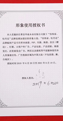 “牡丹花”“怡飾家”品牌是公司主營的注冊(cè)商標(biāo),并與明星句號(hào)達(dá)成合作。14年的板材專業(yè)精神和持續(xù)穩(wěn)健的行業(yè)資源優(yōu)化整合。